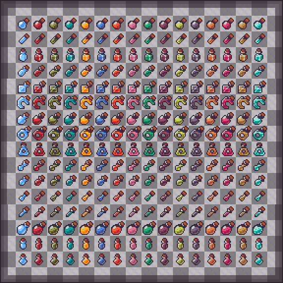 This icon pack features 16 unique and 256 recoloured Potion Icons in total. Icons are provided as individual PNG files and as a complete spritesheet for flexible use. They come pre-scaled in 16x16, 32x32, and 64x64 resolutions